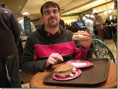 Ice cream cookie sandwiches from the Main Street Bakery! Imagine two cookies as big as your hand, with two scoops of vanilla ice cream smashed in-between. Ryan made it easily through his, then enjoyed taunting me as I struggled to finish mine (yes, I did – but it wasn’t easy).